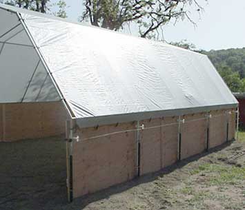 This is an alteration of a standard dome shelter. Normally the tarp would attach to the poles at the bottom of both sides at ground level.This dome was built using 1/2" plywood attached to the bottom section for use with animals.Top tarp is 24' x 24' silver top/white underside. Electric fence is attached below the tarp to keep animals off the structure. Tarp is bungee'd to eyebolts in the plywood. The dome is anchored using t-posts and worm clamps. The back tarp is shaped for the end above the plywood to enclose the structure on one end.